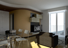Ruolo fondamentale per la separazione delle diverse 'attività abitative' della zone giorno, è svolta dalla veletta curvilinea e dal controssofitto, generata