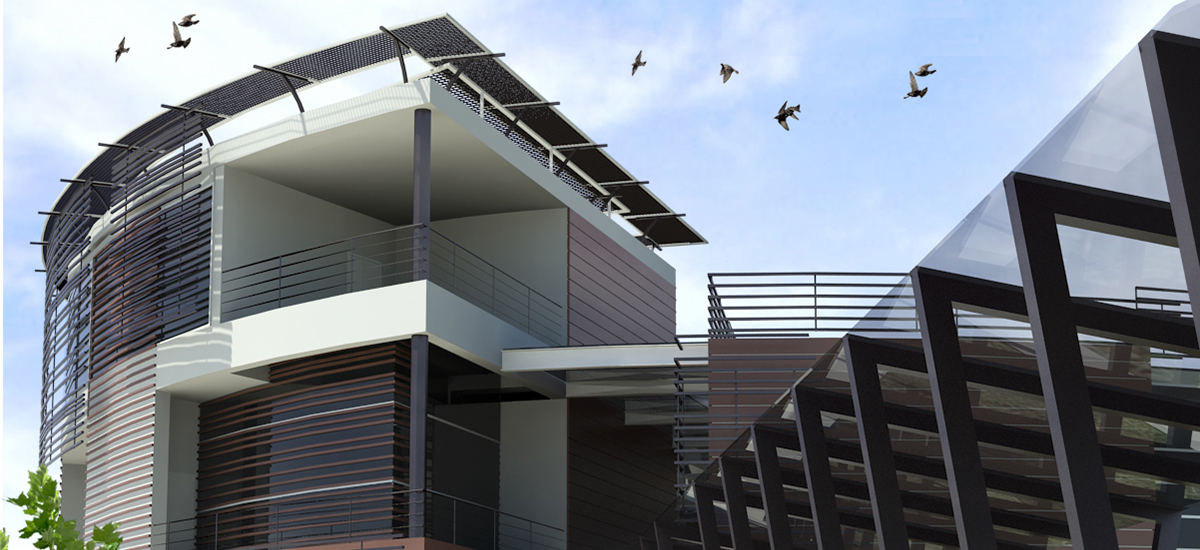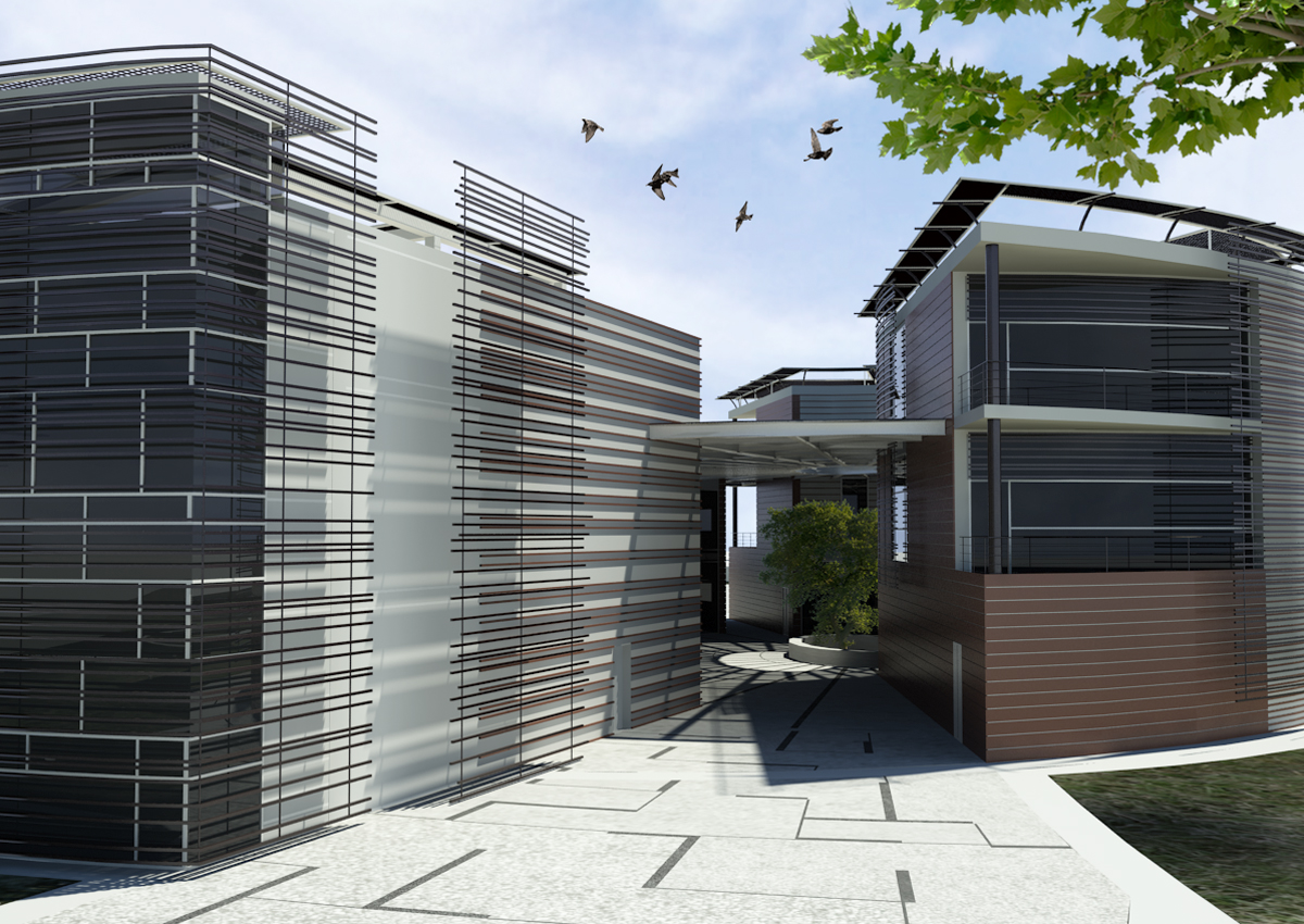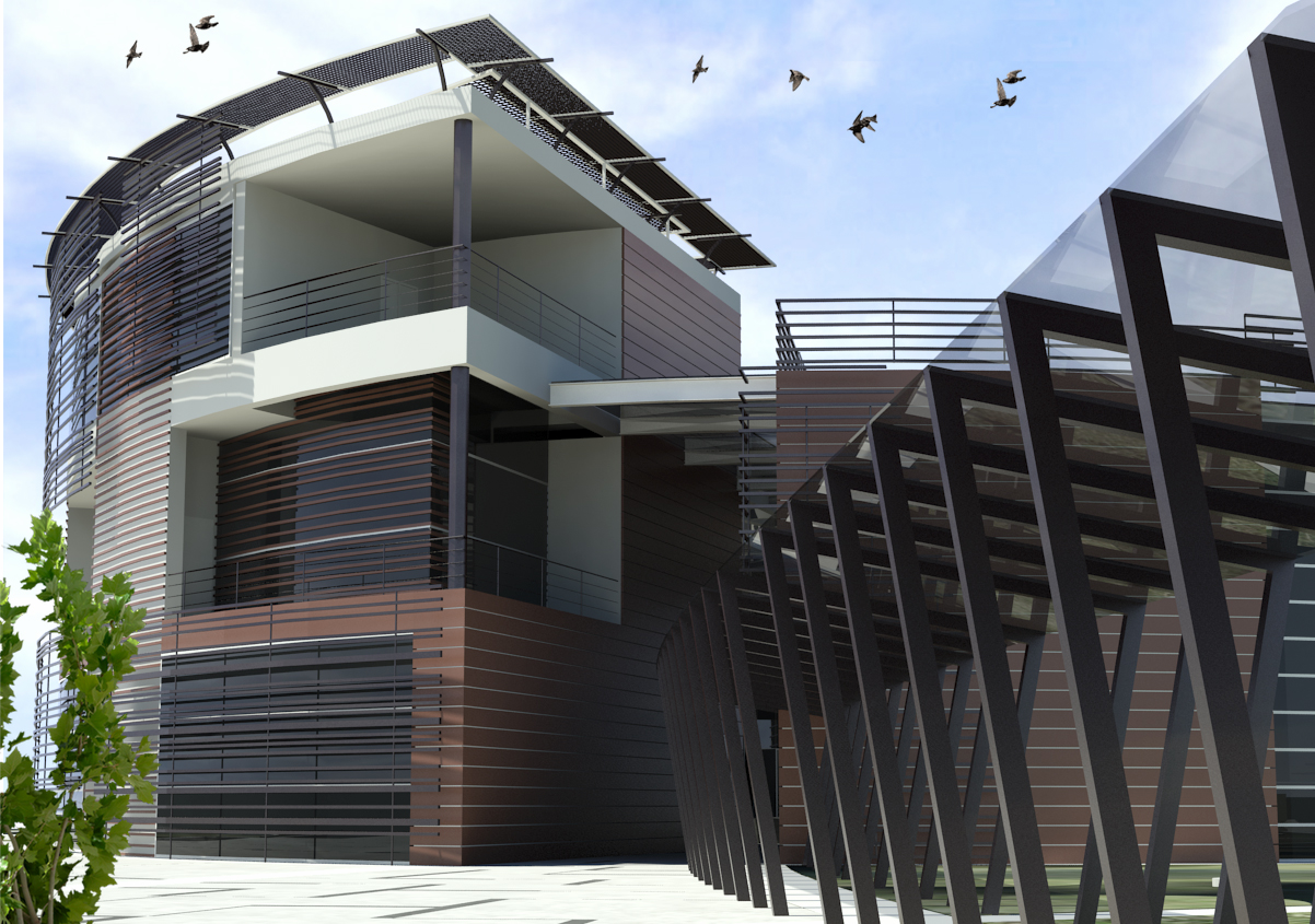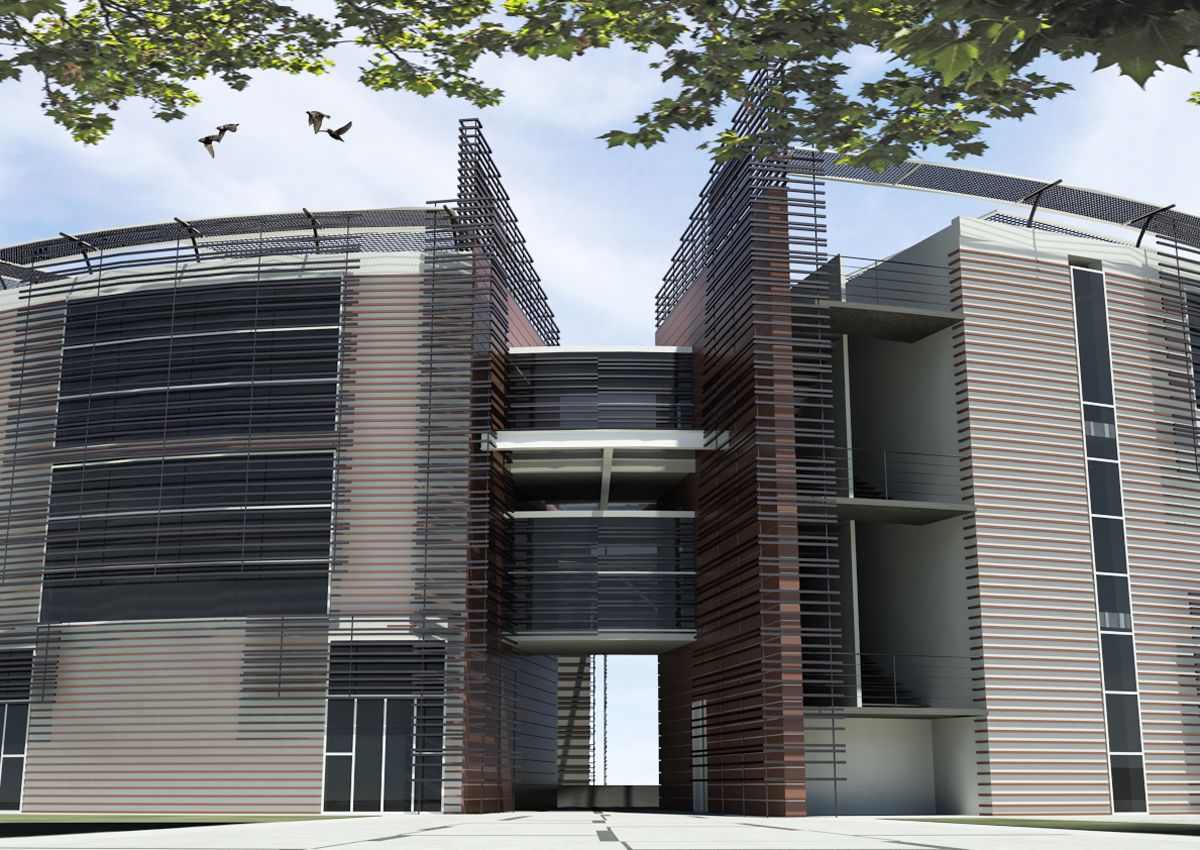 Il complesso sviluppa la tematica del rapporto tra artificiale e naturale, coniugando gli elementi naturali, quali il parco e i percorsi pedonali, agli elementi
