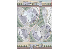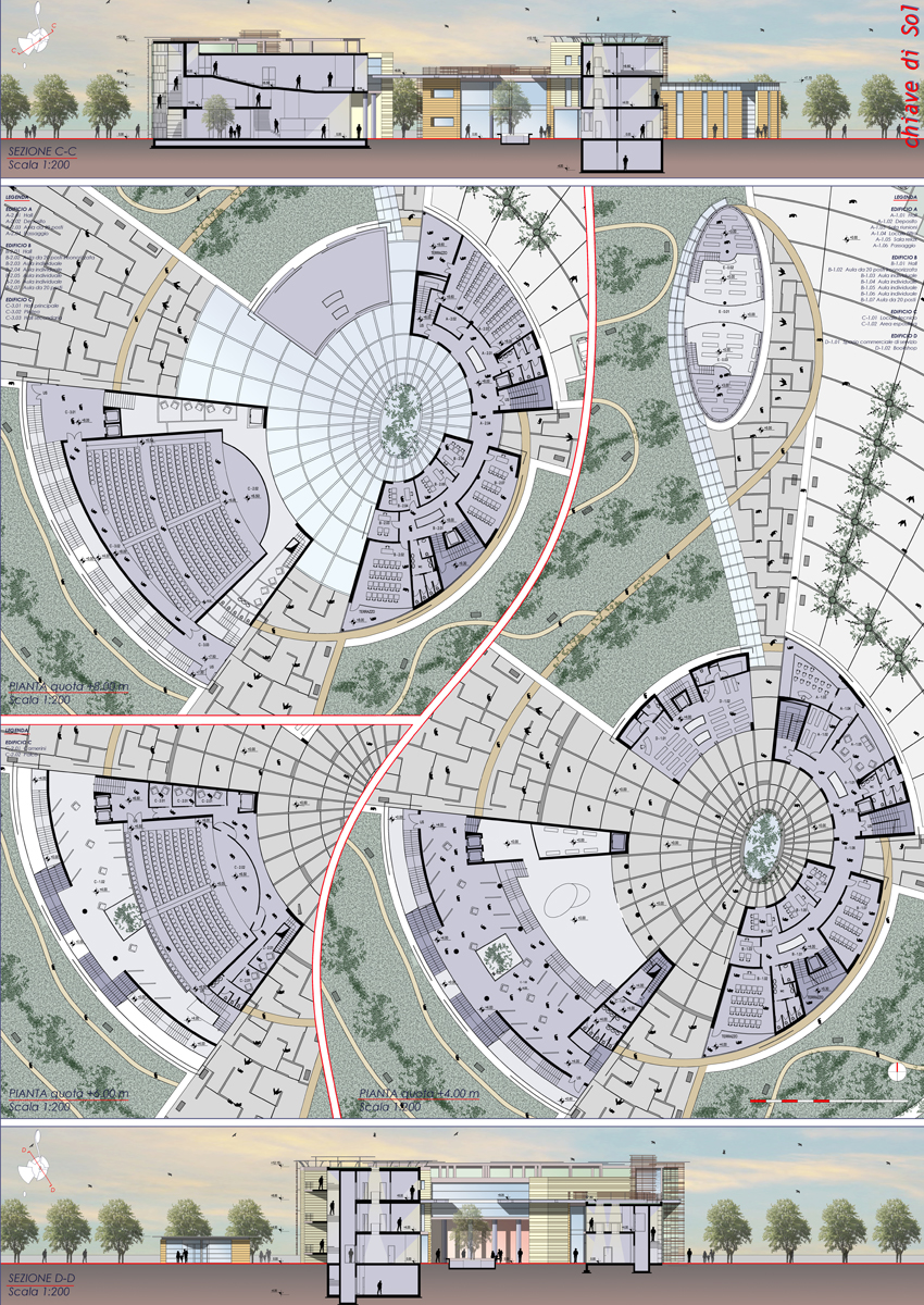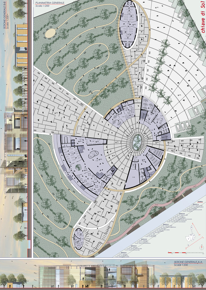 Il complesso nasce dall’idea di organizzare i percorsi pedonali e la disposizione degli edifici su una forma che richiama la chiave di sol: come la chiave di sol è