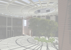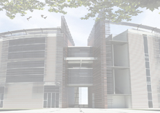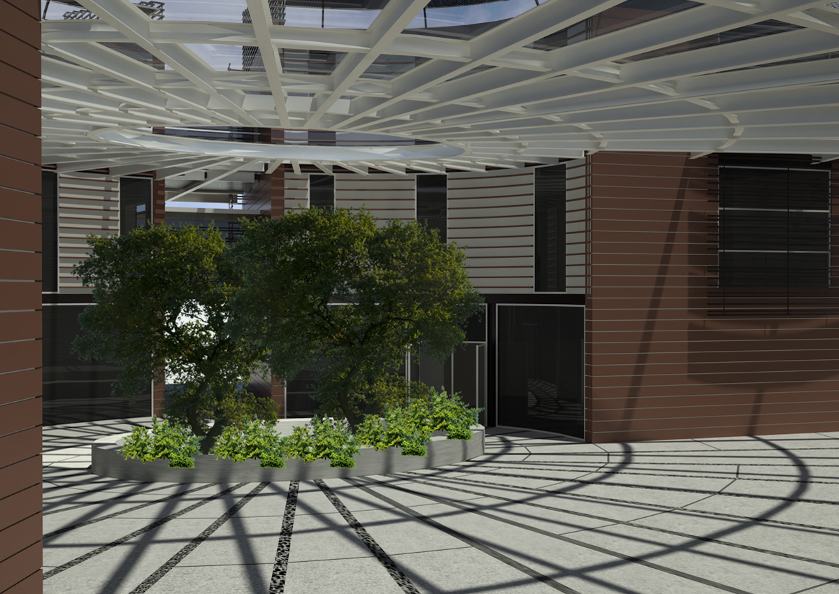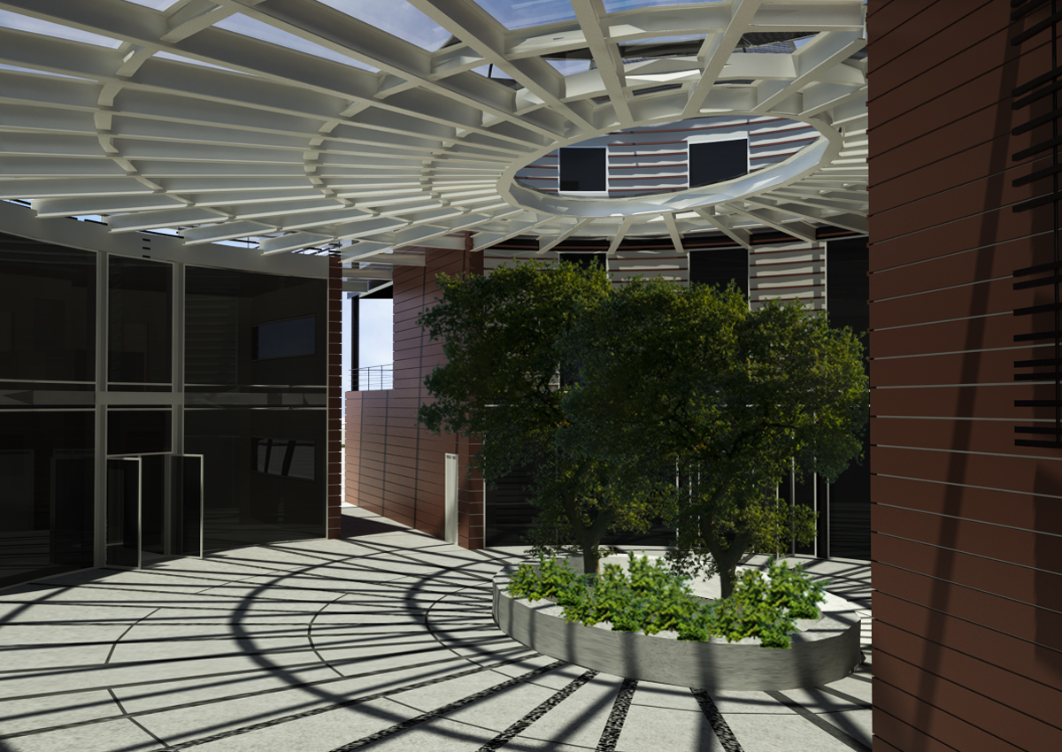 L’ 'occhio ellittico', posto al centro della copertura in vetro della piazza, amplifica l’illuminazione dell’agorà e quindi degli ingressi degli edifici.