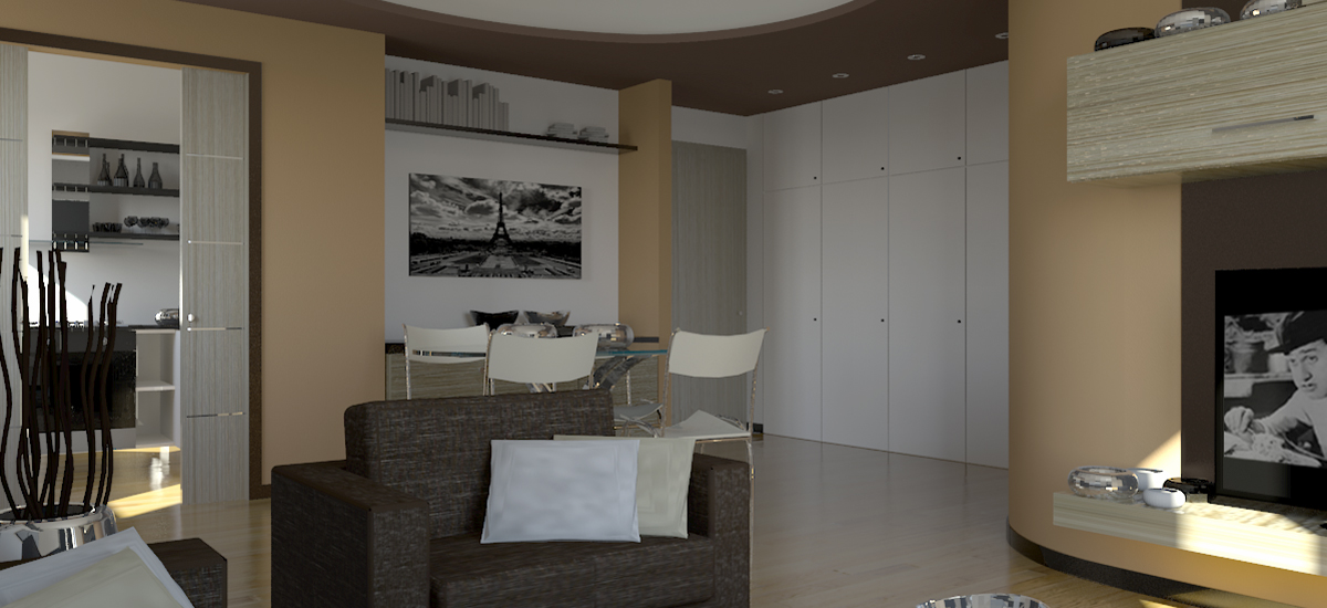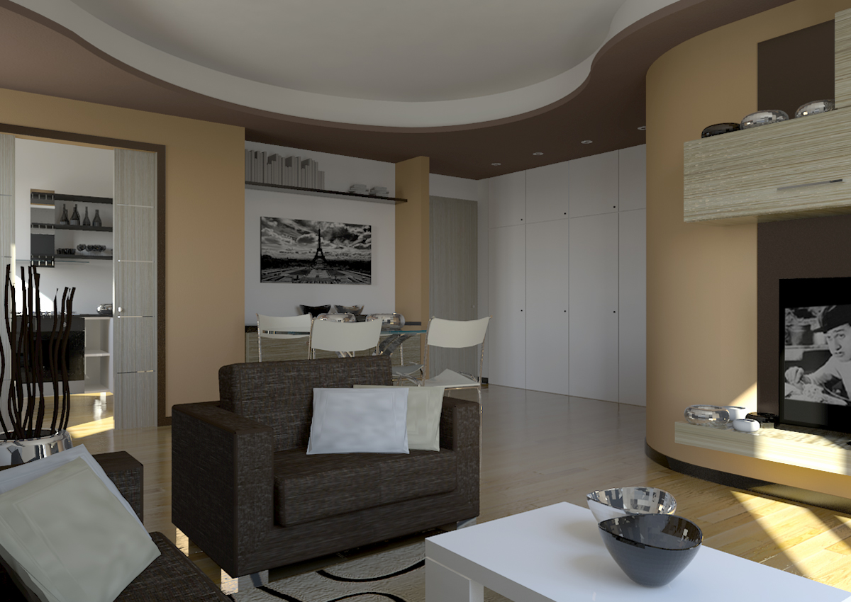 curva e i tramezzi della cucina, il resto delle pareti è di colore bianco; mentre la controssoffittatura è stata tinteggiata marrone scuro, simile ai divani e alla