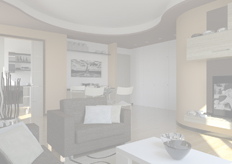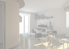 Ruolo fondamentale per la separazione delle diverse 'attività abitative' della zone giorno, è svolta dalla veletta curvilinea e dal controssofitto, generata