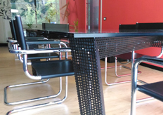 La struttura del tavolo realizzata con una lastra di lamiera forata (fori a sezione quadrata), piegata a sezione triangolare e verniciata di colore nero, funge da